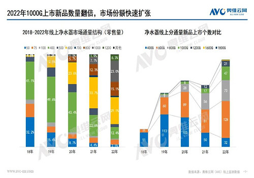 线上净水器近两年呈现大通量产品迭代趋势,消费者为大通量净水器买单。从市场规模上看,奥维云网监测数据显示,2022年线上1000G、1200G零售量市场份额分别占比23%、6.3%,份额同比2021年增加15.3%、4.4%,且线上大通量趋势发展比线下快,2022年线下1000G零售量份额占比不到2%,但在未来两三年内,线下跟随线上进行大通量产品迭代的趋势成为必然。