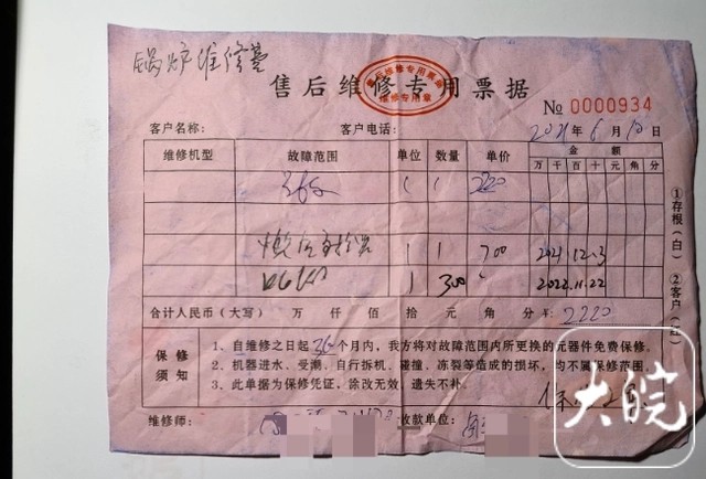 "因为我的热气器确实购买超过8年了,过了质保期,我想着只要能修好也行。"赵先生说,自己家中有年近九旬的老人,没有热水器生活很不方便,便支付了2200元给维修师傅。此后,维修师傅开具了一张售后维修专用票据,称保修期2年。"当时虽然收据上没有写菲斯曼热水器的字样,但我们想着是打官方客服电话报修的,就没有细问。"