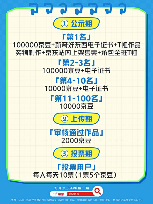 此次大赛参赛对象为全国高等院校学生,需通过京东校园学生认证方可参与。活动时间则分为三个阶段,作品上传期为10月13日至10月19日,其间,学生认证用户需上传原创设计作品;作品投票期为10月20日至10月26日,所有用户可参与投票并赚取京豆;10月27日至10月28日则为结果公示期,届时将公布前100名获奖名单。